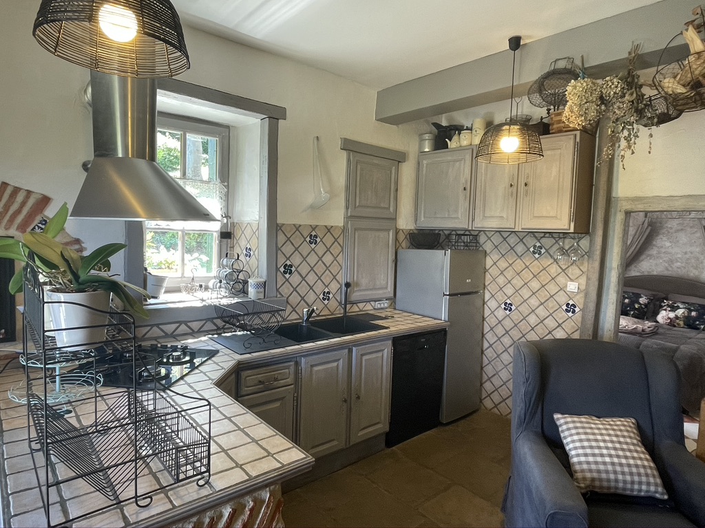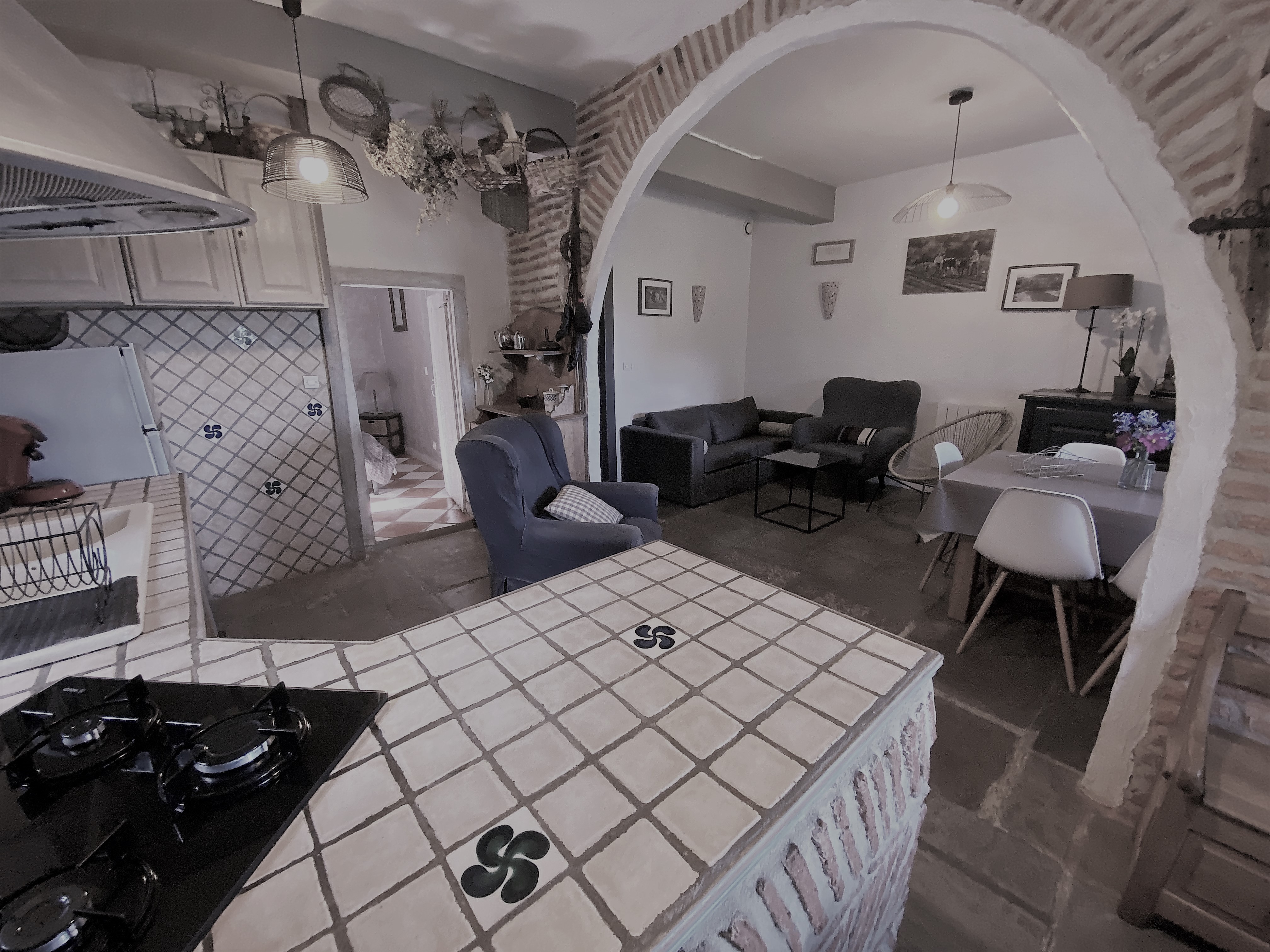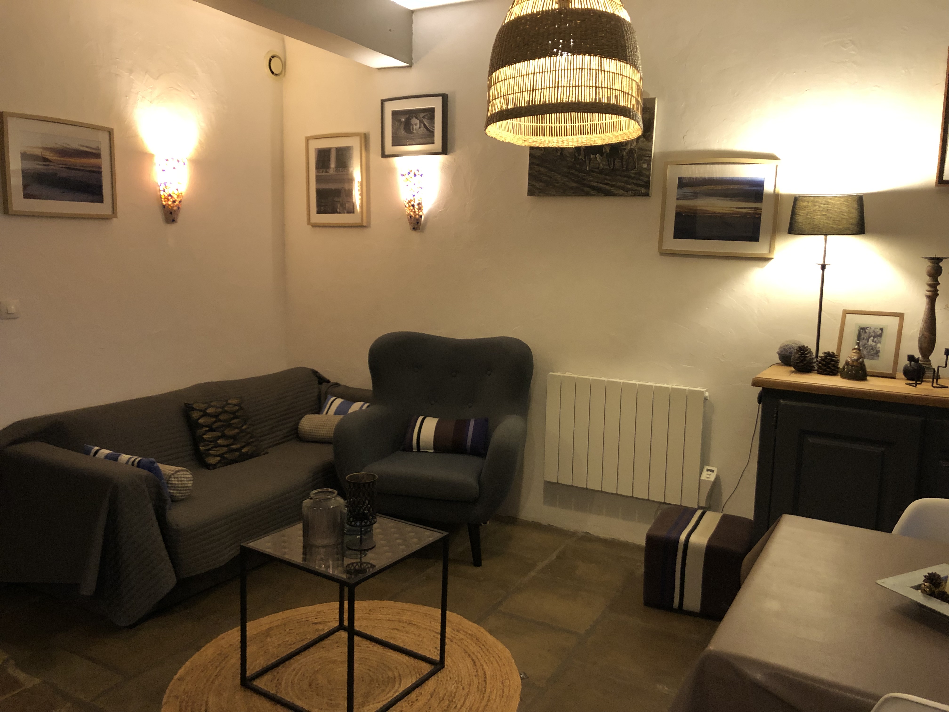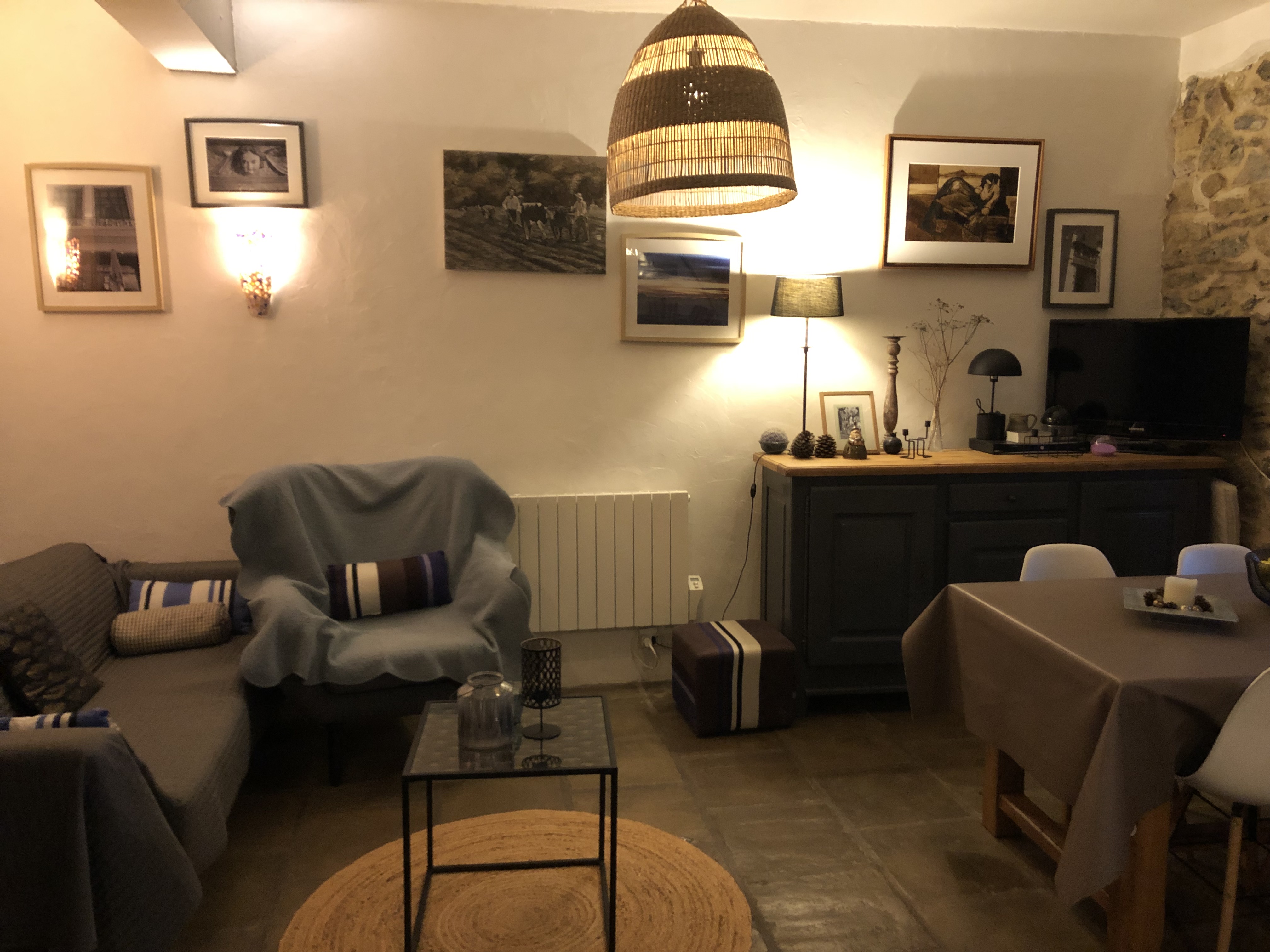 le séjour/salle à manger avec pierres et colombages dispose d'un téléviseur LCD , DVD, d' une table monastère, chaises scandinvaves et d'un canapé convertible. Une enceinte bluetooth pour vous accompagner en musique durant vos vacances. |