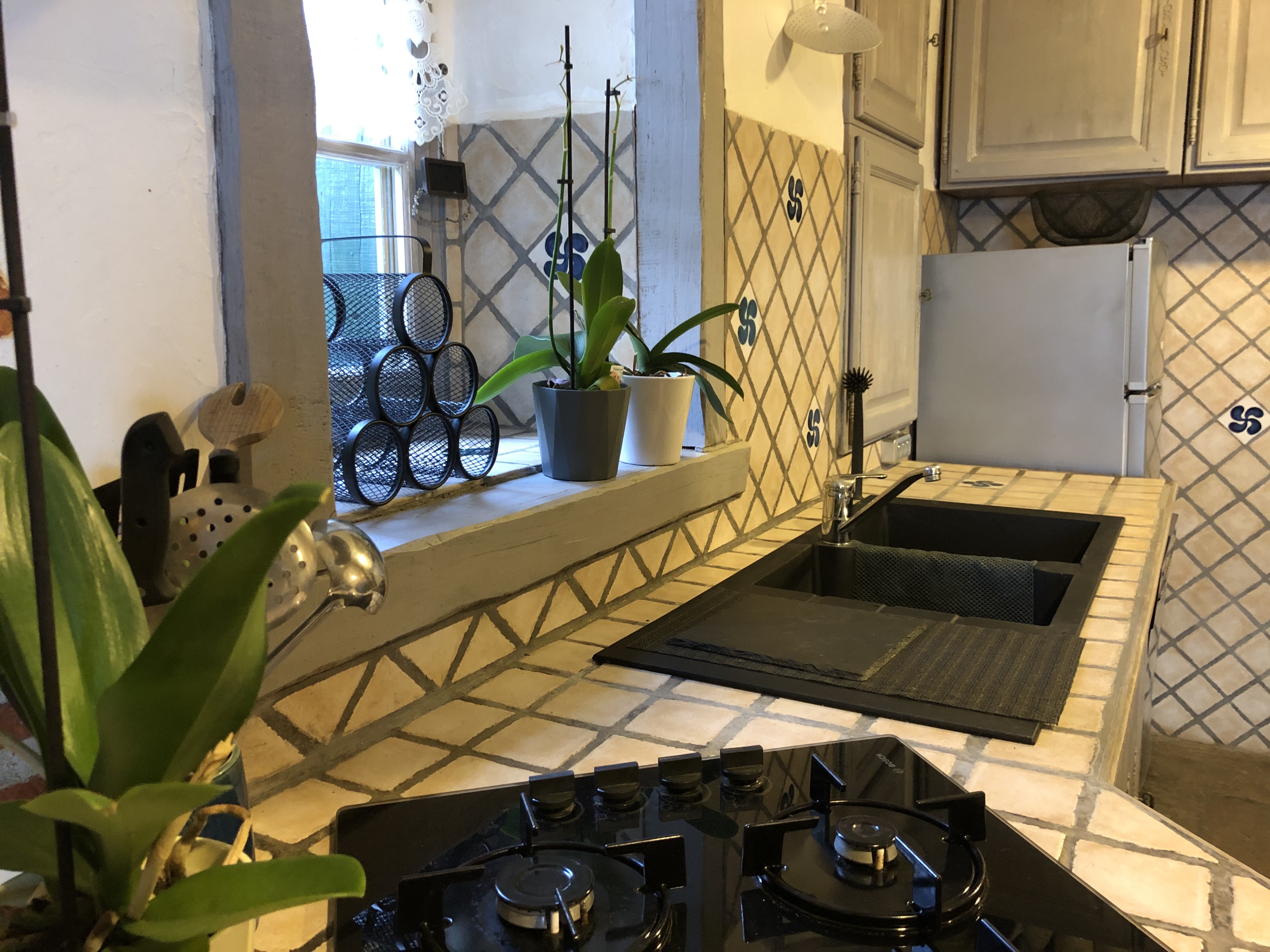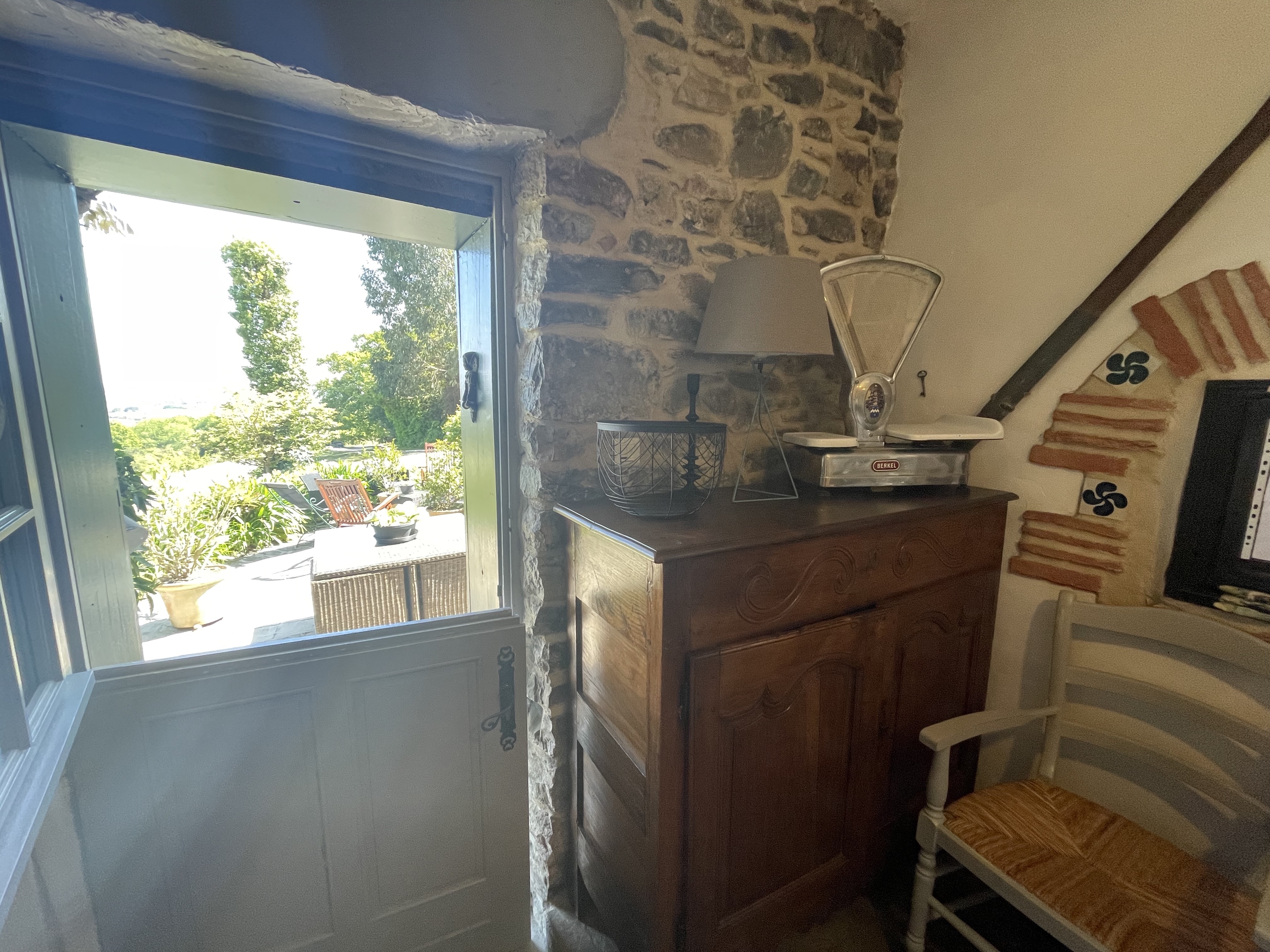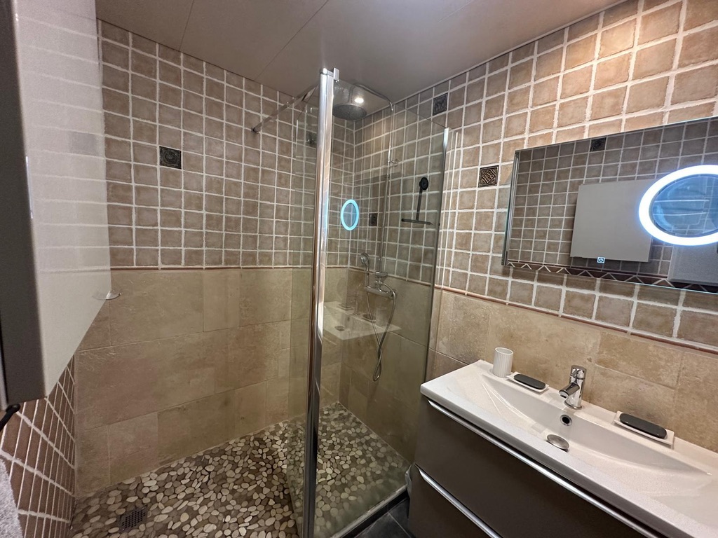 Une grande armoire, chevet, commode. Lintheau de chêne, pierres à nues, rideaux de lin, murs à ancienne nacré et sol damier en harmonie. Deux autres couchages d'appoint sont à disposition sur le canapé convertible du séjour. La salle d'eau présente une spacieuse douche italienne de galets 160 x 90, grès et travertin, miroir lumineux , VMC. WC indépendant. |