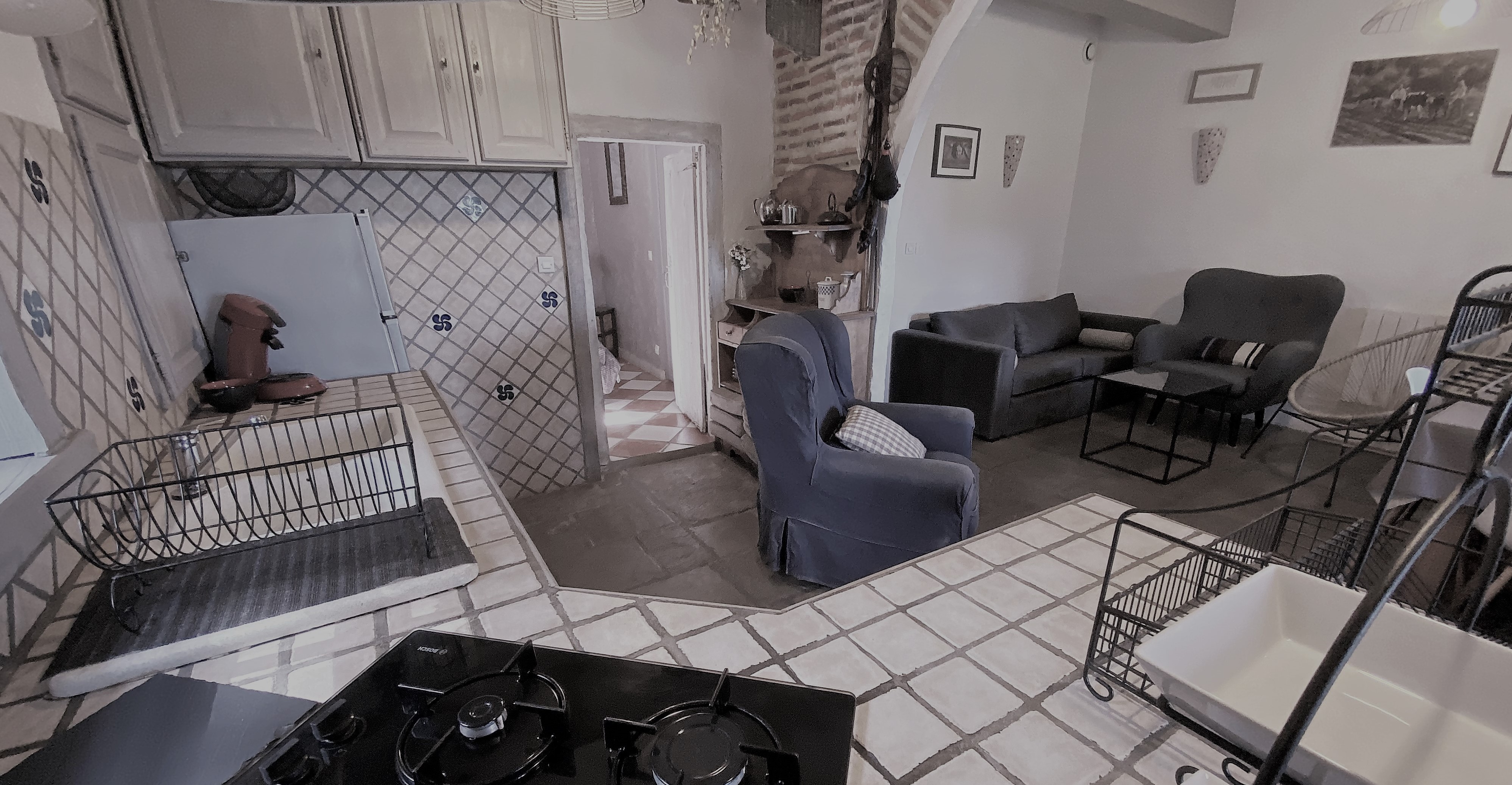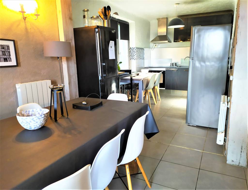 una gran sala, capacidad de 2 a 14 personas, dos sofas, cocina